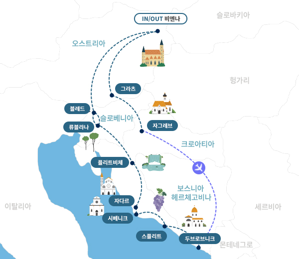 아드리아해의 진주 '두브로브니크' : 성벽 투어, 스르지산 전망대, 구시가지 야경(일몰)고대 로마 황제가 여생을 보내고자 선택한 곳 '스플리트' : 성 도미니우스 대성당(내부)&종탑오래된 역사의 항구 도시 '시베니크' : 성 야고보 교회(내부)요정들이 살고 있는 듯한 아름다운 호수 플리트비체 호수 국립공원줄리앙 알프스의 진주 '블레드' : 블레드 성(내부), 플레트나 보트 탑승 및 블레드 섬(성모승천교회 내부)용이 잠들어 있는 도시 '류블랴나' : 류블랴나 성 후니쿨라 탑승(전동열차)아름다운 해안 마을과 역사유적지 관광(자그레브, 자다르 등)