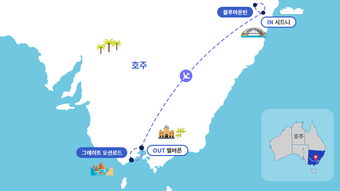 - 호주 최대의 국립공원으로 전설 속의 세자매봉, 에코포인트 관광 - 250m의 수직 절벽을 오가는 놀이기구 시닉 레일웨이 탑승 - 호주 특유의 식물군을 볼 수 있는 2km의 싱그러운 숲속길 시닉 워크웨이 산책하기 - 케이블카에 몸을 싣고 블루마운틴 전경을 감상하는 시닉 케이블웨이 - 시닉 스카이웨이 탑승