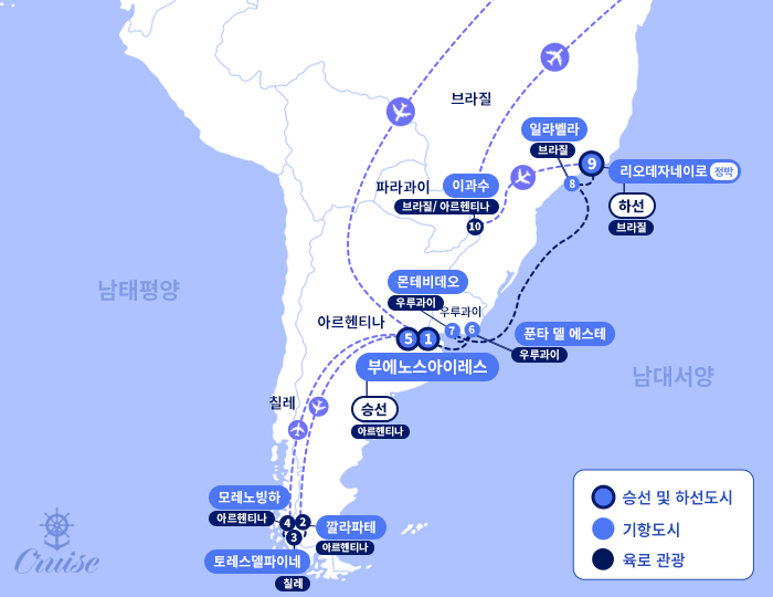 인천-두바이(1) - 부에노스아이레스 - 깔라파테(아르헨티나) ▷ 토레스델파이네(칠레) ▷ 모레노빙하/깔라파테(아르헨티나) ▷ 부에노스아이레스 승선 ▶ 푼타 델 에스테(우루과이) ▶ 몬테비데오(우루과이) ▶ 일랴벨라(브라질) ▶ 리오데자네이로 하선 ▷ 이과수(브라질) ▷ 이과주(아르헨티나) ▷ 상파울로-두바이-인천