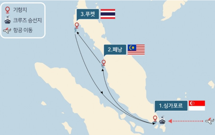 ★ 객실지정은 선사 고유의 권한으로 무작위 배정됩니다. [도시 안내] ▶ 동남아시아 최고의 부국이며 세계 경제의 중심지, 동남아시아 크루즈의 허브도시 싱가포르 관광▶ '동양의 진주'라는 별칭답게 다채로운 볼거리와 훌륭한 관광 인프라로 가득한 페낭 관광▶ 전세계인이 사랑하는 10대 휴양섬 리스트에 매년 이름을 올리는 세계적인 휴양명소 푸켓 관광