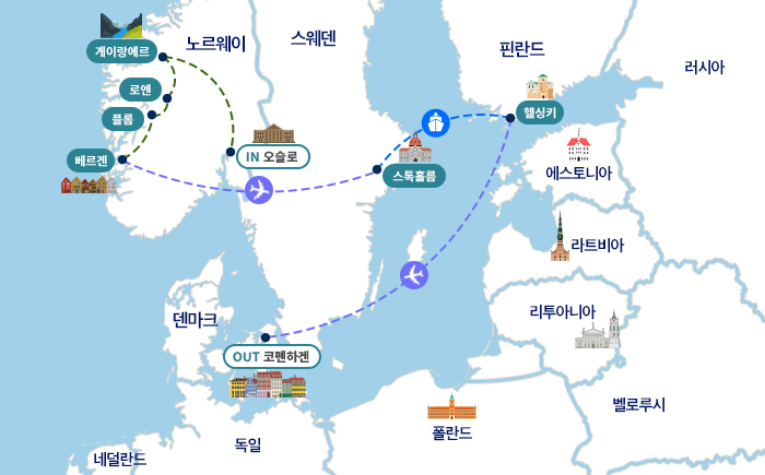 덴마크 코펜하겐,늬하운,인어공주동상,왕궁,시청사노르웨이 베르겐,플롬열차,게이랑에르피오르,송네피오르,빙하,뭉크미술관,비겔란조각공원,오슬로 시청사스웨덴 스톡홀름,시청사,감라스탄구시가지,왕궁,바사호박물관핀란드 헬싱키,원로원광장,암석교회,시벨리우스공원, 광장마켓